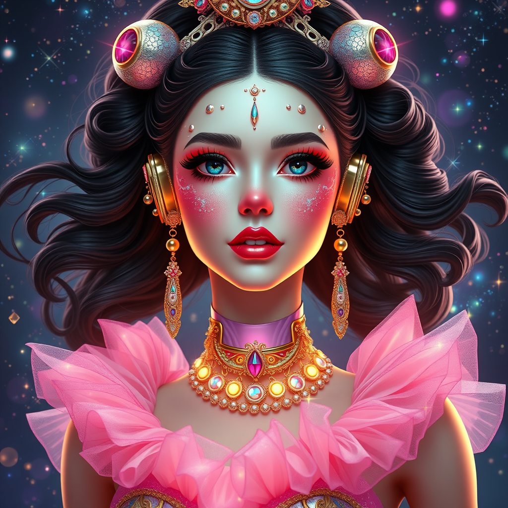 A stunning pixar-style portrait in 8k resolution of a radiant, opulent galactic prima ballerina with a clowncore twist, embodying the charm of a Russian cyborg college girl. Featuring golden ratio elements and set in a sci-fi fantasy cyberpunk world, this intricate and lavish digital painting showcases highly detailed imagery akin to Ever After High. Utilizing octane rendering and drawing inspiration from Artstation, the piece presents a smooth, sharp-focused illustration reminiscent of the artistic styles of Artgerm, Loish, and WLOP, combined with a touch of futuristic elegance and whimsical appeal.