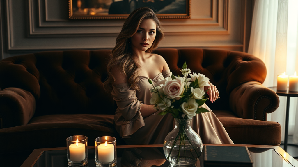 A stunning portrait captures a beautiful woman seated elegantly on a plush velvet couch in a softly lit room, surrounded by the gentle flicker of candlelight. Her lustrous, flowing hair cascades gracefully down her back. She wears a luxurious silk gown that shimmers subtly in the dim light. A vase brimming with fresh blooms rests on the coffee table before her, infusing the air with a delicate, sweet aroma. The ambiance is one of serene elegance and quiet beauty.