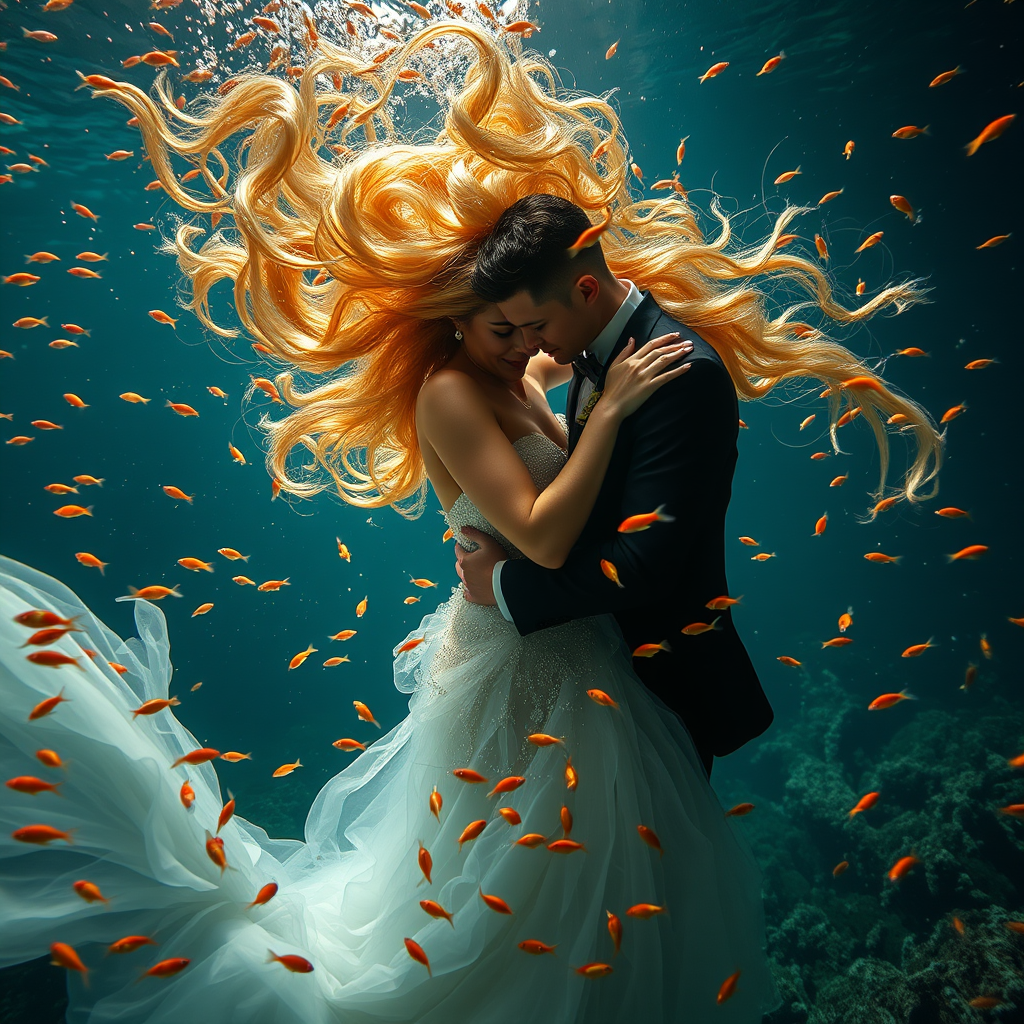 A stunning portrait captures a mermaid bride tenderly embracing her groom amidst a wondrous underwater world. Her luxurious flowing hair swirls gracefully around them, enhanced by the golden shimmer of countless small goldfish. The deep, enchanting background teems with vibrant marine life as soft, filtered light delicately pierces the water. In this cinematic underwater wedding scene, intricate and ornate details abound, with a spotlight highlighting the couple's enchanting love. Shot with a 35mm lens at F/2.8, the image features a subtle vignette and is rendered in breathtaking 4k quality, revealing every elegant, super detailed element.