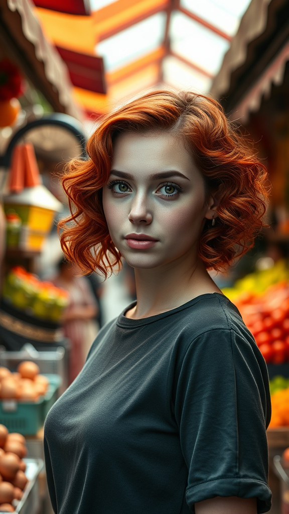 A stunning portrait featuring a young woman with vibrant red hair cascading in soft, wavy curls, standing confidently in a bustling marketplace. Her short hair frames her face beautifully, drawing attention to her bright, curious eyes. The market is alive with color and energy, with stalls brimming with fresh produce and artisanal goods, creating a lively and inviting atmosphere around her.