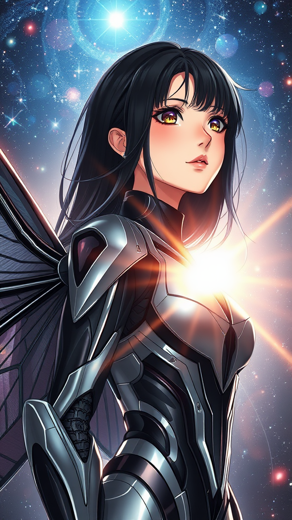 A stunning portrait of a beautiful girl in a sleek Sci-fi exo suit, her gorgeous face adorned with an air of dreamy curiosity. Her long black hair flows gracefully as she gazes into the cosmic expanse. She possesses a slender figure, clad in a glossy, intricately detailed insectoid Sci-fi mech with shimmering black and silver hues. The suit boasts futuristic wings, echoing an insectoid style. The image is crafted in the unique styles of Tsutomu Nihei and Akira, set against a vivid backdrop of bright quasar light in outer space. The dramatic scene includes volumetric graphics, capturing the essence of anime art and manga drawing, with starlight, swirling galaxies, and vibrant plasma beams enhancing the 8k ultra-high-definition imagery. The complex and dynamic lighting effects create an immersive, hyper-realistic atmosphere.