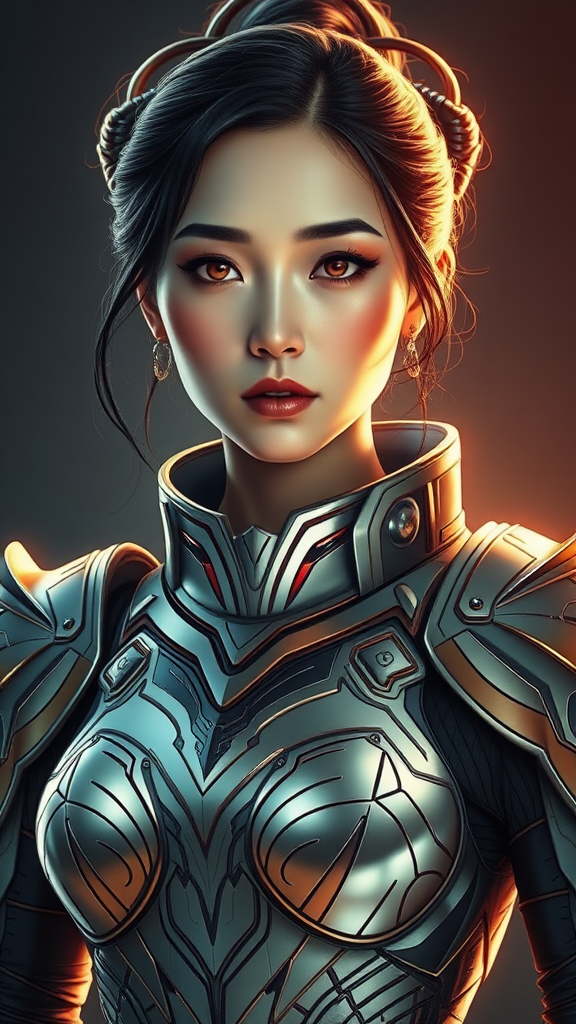 A stunning portrait of a beautiful Japanese female space warrior, adorned in an intricately designed, elegant futuristic armor, exuding an air of fantasy realism. Her detailed outfit blends sci-fi elements with art nouveau aesthetics, featuring geometric patterns subtly inspired by Ruthkowski and Mucha's styles. The image is bathed in a mesmerizing gradient lighting that highlights the reflective surfaces of her armor, adding depth and dimension. Her poised expression and determined gaze capture a sense of strength and grace, completing the masterpiece-worthy scene.