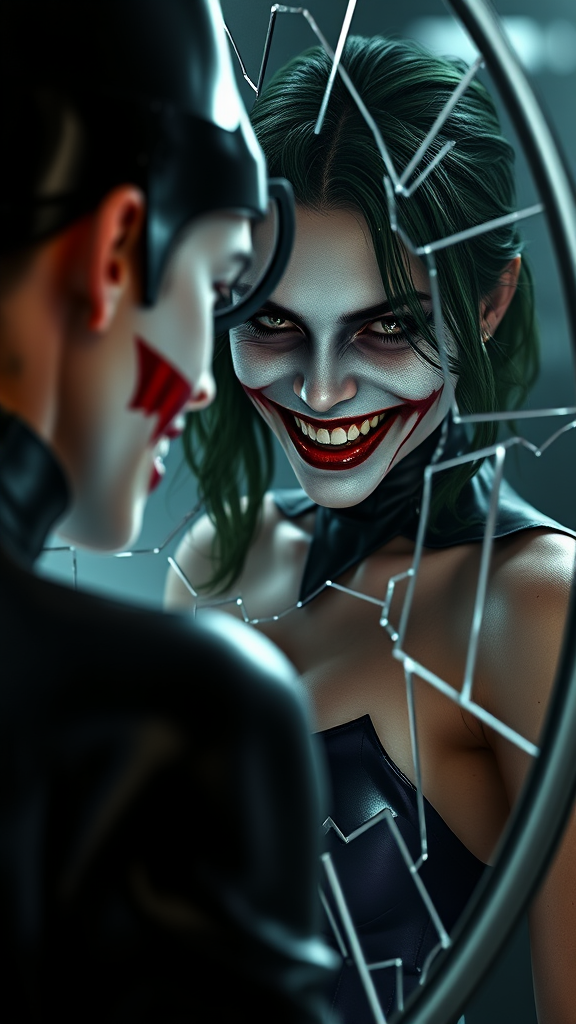 A stunning portrait of a captivating girl embodying the Joker with an expression reminiscent of Christopher Nolan's vision, clad in a sleek, female Batman costume. Her face is twisted into a wicked grin as she peers intently into a fractured mirror, an unsettling air of horror and fear filling the scene. Her elegant physique is subtly showcased, emphasizing professional photographic quality with intricate attention to detail. The image exudes a wallpaper-like realism, intertwining elements of pearl illusion and cyberpunk with contemporary fashion trends. The rendering uses advanced 3D techniques, offering HD clarity and detailed performance, enriched by complex, animated lighting, executed with c4d, octane rendering, and ray tracing for a sophisticated and dynamic composition.