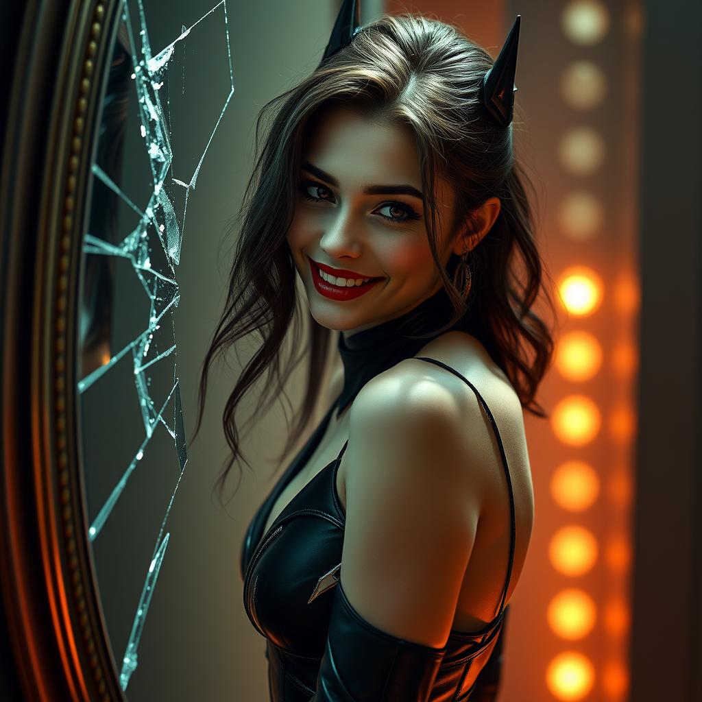 A stunning portrait of a captivating girl embodying the essence of the Joker, set in Christopher Nolan's style. She wears a sleek, futuristic interpretation of a female Batman costume, her expression twisted into a sinister and alluring grin. The narrative unfolds as she peers into a shattered mirror, an aura of horror and suspense enveloping her. Her poised and graceful physique is on display in a professional photo boasting ultra-high detail. The image carries the essence of wallpaper aesthetics, enhanced by a realism touched with a pearl-like illusion. The scene embraces cyberpunk influences and current fashion trends, featuring materials that suggest 3D texturing reminiscent of 3s material. Rendering is achieved using HD octane rendering with complex ray tracing, allowing for intricate detail and animated dynamic lighting in a sophisticated interplay of visual elements.