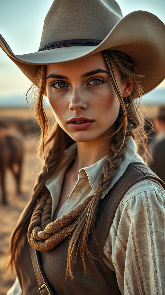A stunning portrait of a captivating rancher girl with a flawlessly symmetrical face and subtle, natural makeup. She wears traditional western attire that highlights her elegance and femininity, posing confidently in a rural setting. The scene captures the essence of the wild west with ultra-realistic, highly detailed character concept art. Photographed with an 85mm lens in a medium shot, the composition includes delicate volumetric fog that adds a dreamy ambiance, echoing trends on Instagram and Tumblr. The high dynamic range (HDR) image in glorious 4k and 8k resolution brings every intricate detail to life, making it a truly mesmerizing visual experience.