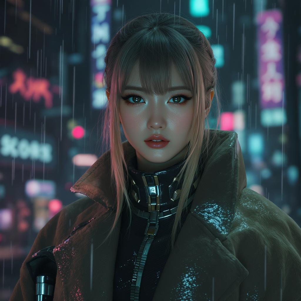 A stunning portrait of a European Pretty Young Girl wearing a sleek Storm Rain movie jacket and coat, blending futuristic sci-fi fashion with royal attire. The image is a harmonious creation by Ismail Inceoglu, Dragan Bibin, Hans Thoma, Greg Rutkowski, Alexandros Pyromallis, Nekro, and Rene Magritte. Her face is perfectly composed with a sharp chin and exquisite details, capturing the essence of a cyberpunk neotokyo universe. The scene is set against a Bladerunner-inspired backdrop, filled with synth-wave aesthetics and low-emission neon lights. Dramatic lighting accentuates the image, enhancing the high detail of this RAW color photo. The portrait showcases hyper-realistic lifelike textures in ultra-high resolution, resembling an 8K CG wallpaper. With physics-based rendering, the image possesses a hyperrealism emphasized by a photography f1.6 lens, delivering rich colors and perfect realism. Despite being crafted as a CGI illustration with elements of anime and digital art, the overall effect remains convincingly realistic, avoiding common pitfalls like poorly drawn features or unnatural proportions. The girl's attire and sophisticated expression are captured flawlessly, embodying the imaginative world of cyberpunk futurism while retaining a regal air.
