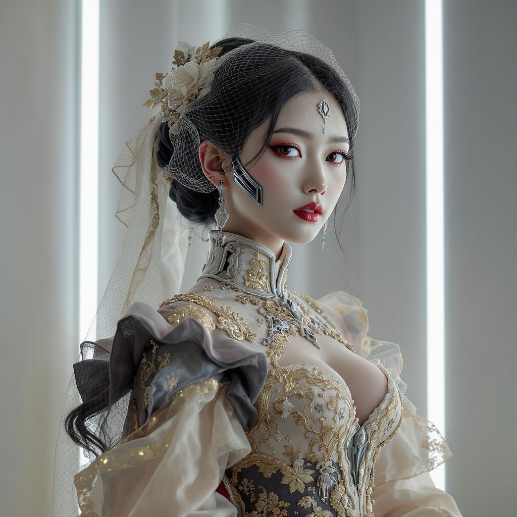 A stunning portrait of a girl as a beautiful, elegant cyborg, dressed in an ornate, high-fashion fantasy ensemble. The fusion of Victorian and Chinese elements creates a captivating attire featuring veils and a Victorian dress adorned with intricate Chinese patterns. Inspired by the siren form from Jibaro on Netflix, the design is enriched with couture ornamentation, featuring gold filigree details that exude a dynamic and particulate essence. The composition bursts with rich colors, epitomizing elegance akin to Harper's Bazaar covers. The artwork is centered and crafted with smooth, sharp focus, reminiscent of an octane render where reflections and caustics play a mesmerizing dance, enveloped in a white neon glow. The Autochrome Pearl Portrait effect lends a luminous quality, blending Pearl Silverplate, Pearl, Golden Jewelry, and Silverplate into its intricate framework. The girl's facial features are exquisitely detailed, reflecting ultrafine hyper-detailing by artists like Kim Jung Gi, Soey Milk, WLOP, Artgerm, Greg Rutkowski, and Alphonse Mucha. Rendered using Unreal Engine 5, the scene boasts highly realistic global illumination and radiant light, filling the richly detailed environment with a Final Fantasy-like ambiance.
