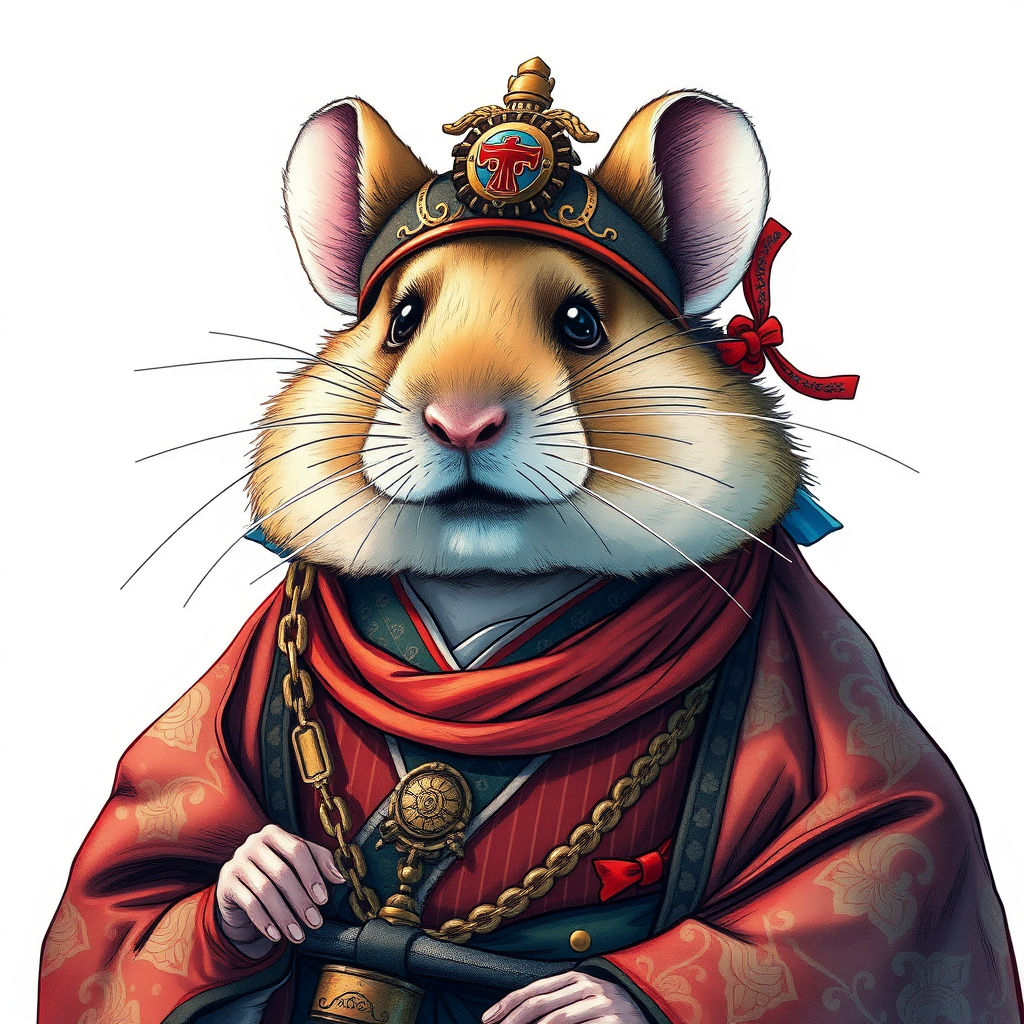 A stunning portrait of a hamster adorned as a feudal Japanese emperor, showcased prominently with intricate linework and vibrant colors. The composition exudes breathtaking beauty, with precise details capturing the essence of a cinematic piece. Influenced by the styles of Carne Griffiths and Conrad Roset, this 8k low-resolution image highlights the central figure with comprehensive artistry. Despite a few creative liberties, the artwork focuses on an intricate depiction, avoiding common artistic errors such as poor anatomy or extra limbs. The background remains minimal, ensuring the hamster in regal attire is the focal point without distractions such as signatures or watermarks.