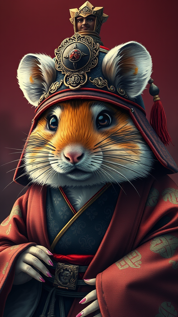 A stunning portrait of a hamster garbed as a feudal Japanese emperor, perfectly centered with intricate and highly detailed elements that capture its breathtaking beauty. The precise lineart and vibrant colors embody a comprehensive cinematic style, influenced by the artistry of Carne Griffiths and Conrad Roset. Rendered in 8k resolution, the portrait remains free from distortions such as missing or extra digits and avoids any anomalies like watermark artifacts or poor anatomy. Instead, it showcases a harmonious and captivating character with flawless features, ensuring an unforgettable visual impression.