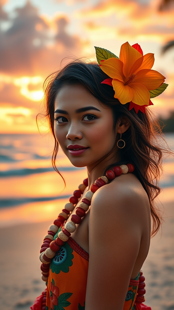 A stunning portrait of a Hawaiian girl at the beach during dawn, showcasing her in a traditional outfit with breathtaking beauty. The composition is centered with intricate detail, vibrant colors, and precise lineart in a comprehensive cinematic style inspired by Laurie Greasley and James Jean. The image exudes an 8k, HDR quality, capturing the essence of tiki culture. While maintaining its allure, the portrait playfully hints at the imperfections of artistry with touches of error and text, alongside hints of JPEG artifacts and signature marks, adding a unique character to the overall composition.