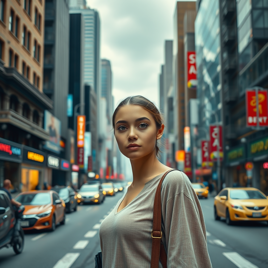 A stunning portrait of a lone young woman standing confidently on a city street, her remarkably detailed face capturing the essence of the bustling metropolis surrounding her. The scene is alive with intricate architectural backgrounds and a lively road, highlighting the dynamic interaction between human and urban life.