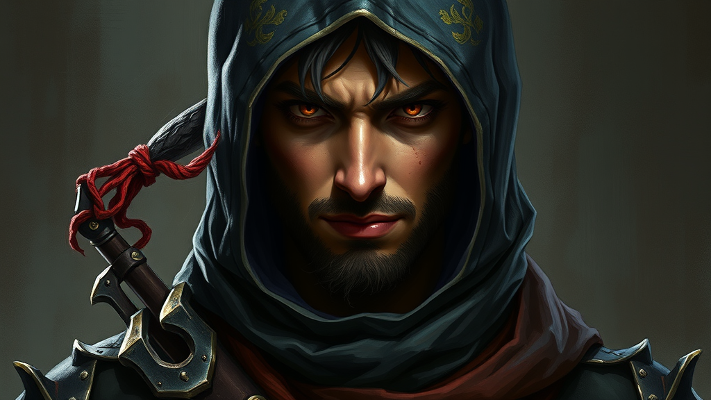 A stunning portrait of a male rogue, featuring symmetrical features and highly detailed artwork, capturing the essence of a fantasy RPG character. This masterpiece, worthy of accolades, showcases a lifelike, full-body depiction, akin to a 16k resolution reference sheet. Inspired by the world of Dungeons and Dragons, the image presents an enigmatic and cunning figure, set in a richly textured fantasy realm, evoking a sense of adventure and mystery.
