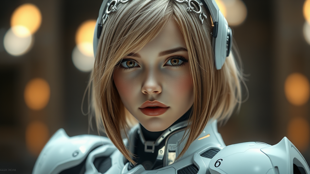 A stunning portrait of a mecha girl with beige blonde hair transitioning to dark tips. Her features are angelic with seductive eyes and pouty thin lips. She's adorned in sleek white-silver armor with intricate head accessories, set against a bokeh background that enhances the scene's depth. The cinematic lighting casts a soft glow, with HDR and light bloom effects creating a photorealistic ambiance. The concept art suggests ultra high-detail, seen in the fine textures and reflective surfaces, as if rendered in unreal engine 5 with RTX capabilities. Noticeably, her arms and hands are absent, adding a unique intrigue to her presence.