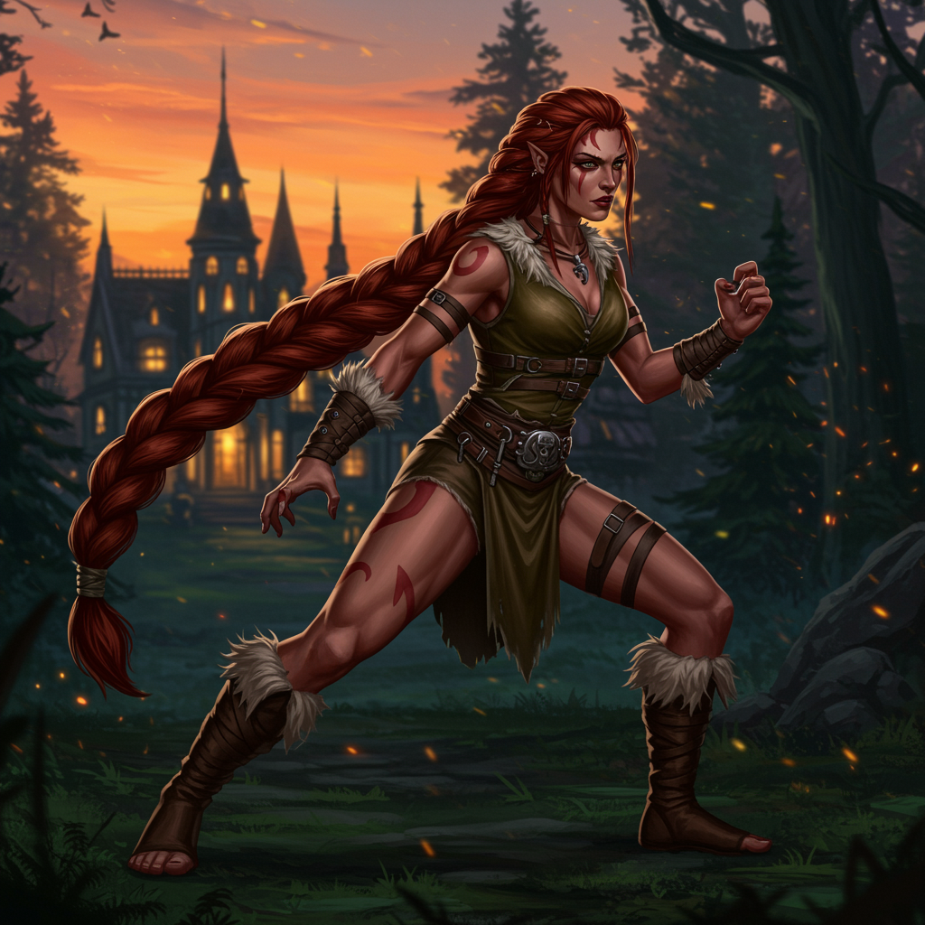 A stunning portrait of a powerful Lumberjack woman, her massive and elegant braid cascading down her back, clad in a form-fitting outfit that highlights her strength. She strikes a dynamic and intricate action pose, surrounded by the warm glow of twilight. The scene is set against the majestic backdrop of an ancient, grand house and a timeless forest, evoking a sense of mystery. Inspired by the brilliant artistry of Allan Jabbar, Yann Dalon, Toni Infante, and Amr Elshamy, this image weaves small creative nuances into its core concept, blending oil paint traditions with a contemporary, enigmatic flair.