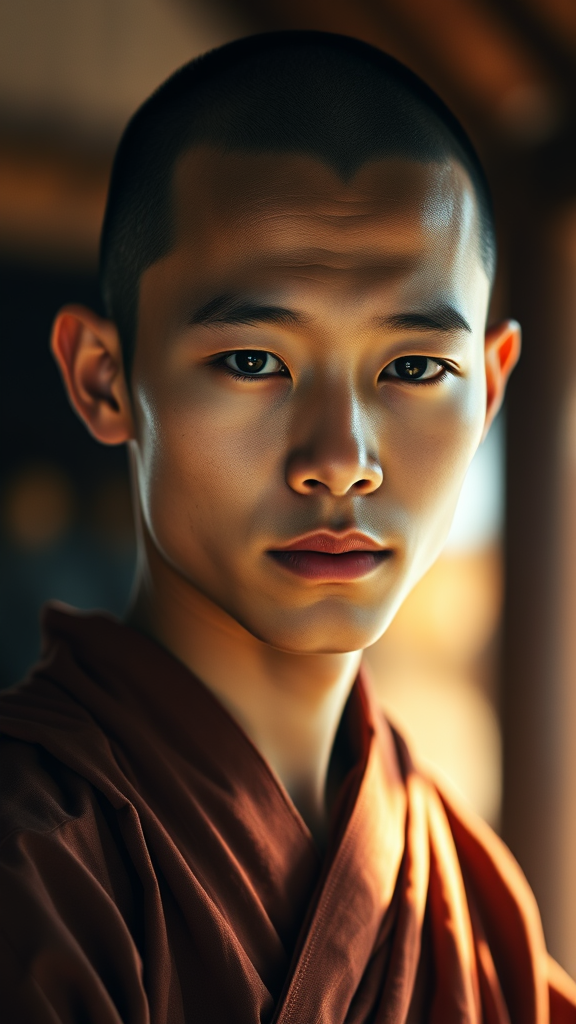 A stunning portrait of a serene young monk, exuding calmness and beauty, captured in a photorealistic style with a radiant glow. The cinematic lighting adds depth and warmth, highlighting the monk's tranquil expression. Shot in high-resolution 8k using a 35mm lens at f1.4, the image employs Fuji film colors for a rich, natural palette. Emphasizing mindfulness and inner peace, this composition incorporates a slightly dreamy, ethereal quality, enhancing its meditative allure. The background subtly blends into soft focus, directing attention to the monk's peaceful visage.