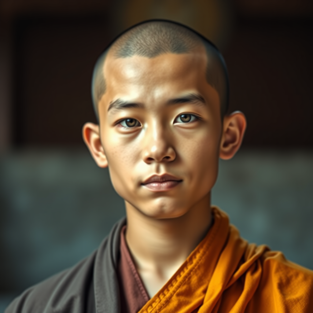 A stunning portrait of a serene young monk exuding beauty, captured with a realistic and radiant essence, utilizing cinematic lighting to highlight their tranquil expression, shot on 35mm f1.4 Fujifilm, featuring a backdrop that enhances the calming ambiance, showcasing gentle modifications that evoke a sense of peace and introspection, maintaining the core concept of zen tranquility.