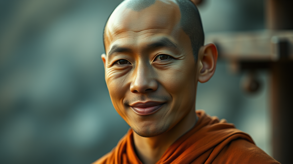 A stunning portrait of a serene young monk exuding tranquility and beauty, captured with cinematic lighting in a glossy, realistic 8k resolution; the scene is reminiscent of a moment frozen in time, shot with a 35mm f1.4 lens on Fuji color film, offering deep, rich colors that highlight the peaceful aura. The monk's subtle, gentle smile and wise eyes convey a lifetime of inner peace, with soft background blur enhancing focus on their contemplative expression, alluding to an ethereal presence that captivates and soothes the viewer.