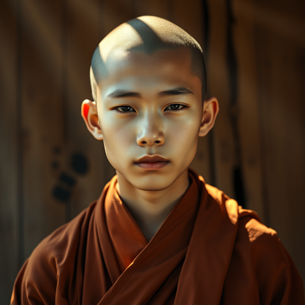 A stunning portrait of a serene young monk exuding tranquility, captured in realistic detail with radiant features, using 8k resolution and cinematic lighting. The scene is shot with a 35mm f1.4 lens on Fuji color film, providing a rich and vibrant color palette. Subtle creative elements introduce a gentle breeze that softly rustles the monk's robe, and delicate beams of sunlight play across the rustic wooden background, enhancing the peaceful atmosphere.