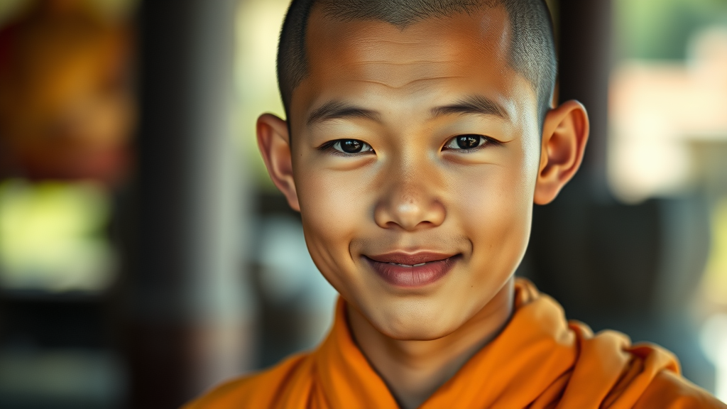 A stunning portrait of a serene young monk, featuring realistic details and a radiant aura, captured in cinematic 8k quality with delicate lighting. The image is shot with a 35mm f1.4 lens using Fuji color film, enhancing the richness of the scene. The monk exudes tranquility, with calm, focused eyes and a gentle smile that conveys inner peace. The background is softly blurred, emphasizing the monk's presence and the harmony of the environment, while subtle creative adjustments enhance the depth and mood of the composition.