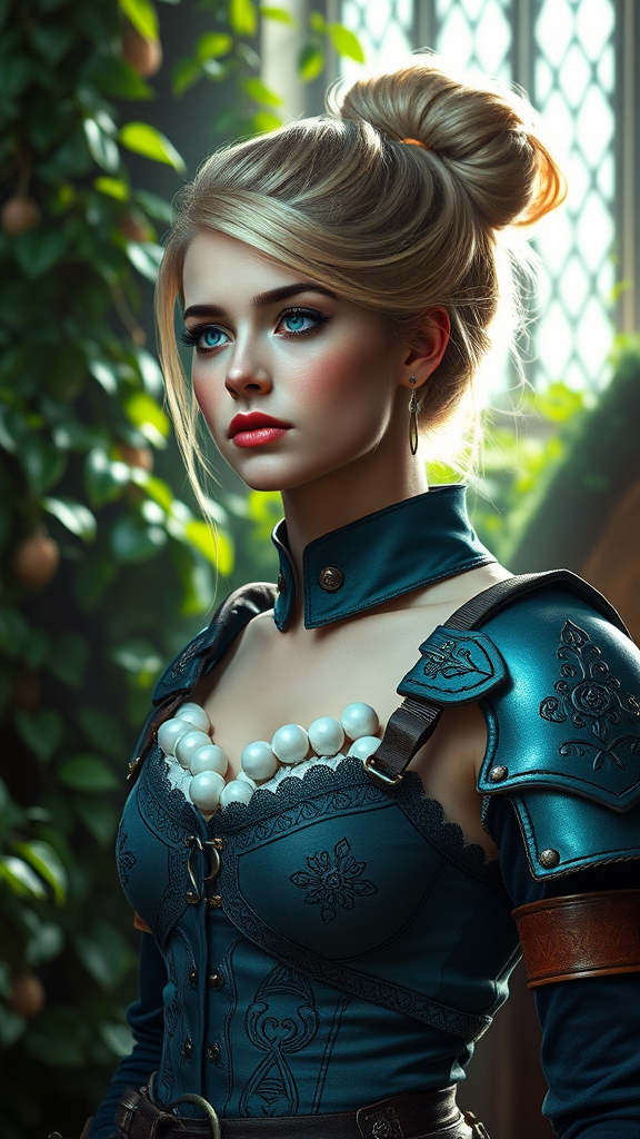A stunning portrait of a solitary medieval RPG character, capturing a beautiful girl with upswept blonde hair in a sophisticated updo. She embodies the essence of a swashbuckler rogue, dressed in a corset shirt paired with intricately designed teal armor. The setting is indoors, with an air of enchantment marked by overgrown foliage, illuminated by bright morning light streaming in from the side. Small details add depth, like delicate earrings and a hint of intrigue in her observant gaze, enhancing the enchanting atmosphere of the scene.
