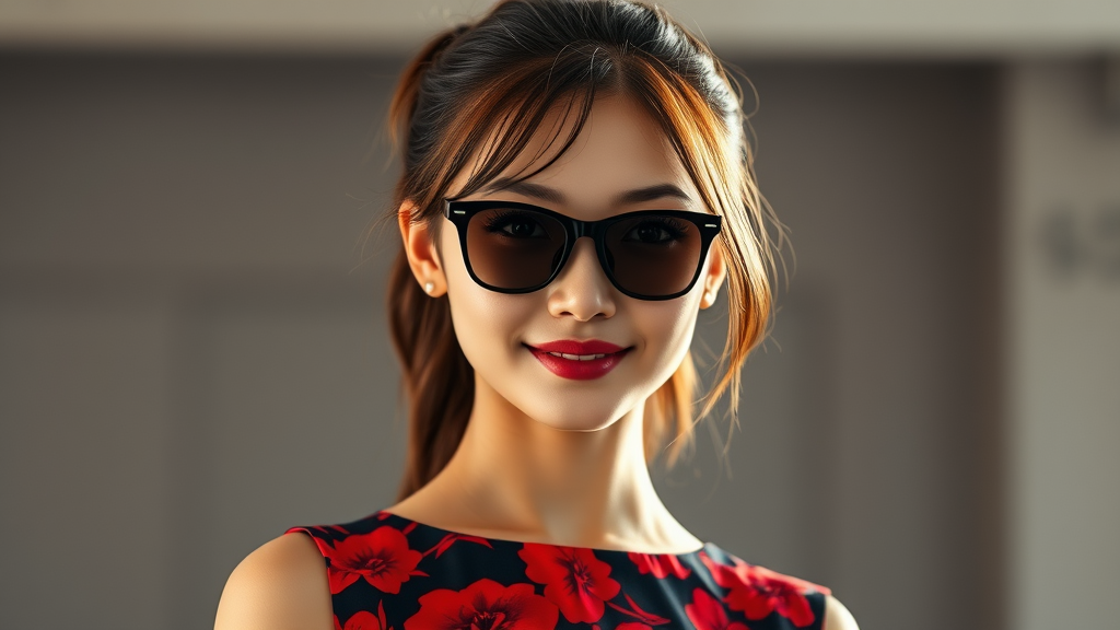 A stunning portrait of a Southeast Asian girl with medium-length brown hair styled in a ponytail. She poses confidently with a friendly expression, gazing directly at the viewer. Her face is impeccably detailed with beautiful eyes, and she's wearing sleek black sunglasses. Her body proportions are harmonious and she dons a striking red and black floral mini dress that complements her toned physique. Captured in a full-length shot, the image boasts high-definition RAW color, vibrant and sharp, with hyperrealism elements reminiscent of cinematic movie posters. The artwork is illuminated with dramatic lighting, showcasing intricate details and artistry, creating a visual masterpiece.