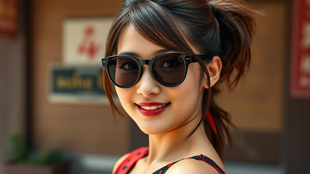 A stunning portrait of a Southeast Asian woman with medium-length brown hair styled in a ponytail, facing the viewer with a friendly expression. Her highly detailed face showcases perfect features and beautiful eyes, partially shaded by stylish black sunglasses. She is dressed in a red and black floral mini dress that complements her toned physique, embodying ideal proportions. The artwork exudes a cinematic quality with hyperrealism and intricate details, reminiscent of a masterpiece by Greg Rutkowski and Magali Villeneuve. The scene is vividly colorful, captured in sharp focus with high detail, as if part of an epic movie poster, revealing a full-length view in a 9:16 aspect ratio, with an emphasis on vibrant photography and elaborate artistry.