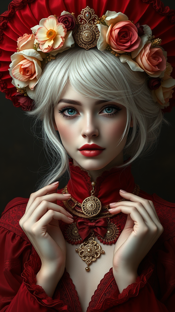 A stunning portrait of a white-haired woman in a captivating red dress and a white hat adorned with gold details on her face, inspired by the artistic styles of Gaston Bussière, Rutkowski, Mucha, and Tim Burton. This digital painting presents a close-up headshot of a Nychosian goddess-like figure wearing an intricate floral crown, her hands gracefully holding golden filigree ornaments around her neckline. The background is a dark fantasy setting, with an immersive, cinematic quality highlighting the dramatic, award-winning lighting. Rendered in 4K, the artwork captures hyper-realistic details with photorealistic precision, reminiscent of the works of Greg Hildebrandt, Ivan Albright, and Michael Whelan. The composition exudes a high-fashion magazine cover aura, combining the surreal and atmospheric with elements of Gustav Doré and René Magritte's influence, maintaining a sense of elegance and beauty throughout.