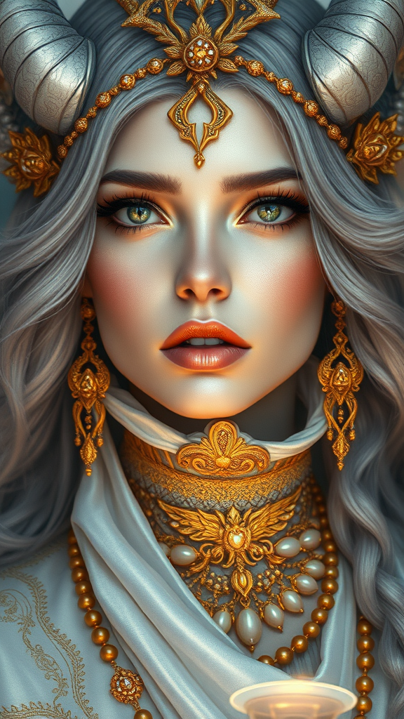 A stunning portrait of a woman adorned in demon-inspired attire, featuring hues of soft gray and shimmering gold. The image is a vibrant and intricate illustration, capturing a hyper-detailed and realistic portrayal. The color palette includes delicate whites and warm amber tones, evoking a sense of regal elegance, reminiscent of a queencore aesthetic. The artwork blends elements of fantasy and reality seamlessly, creating a mesmerizing and lifelike depiction.
