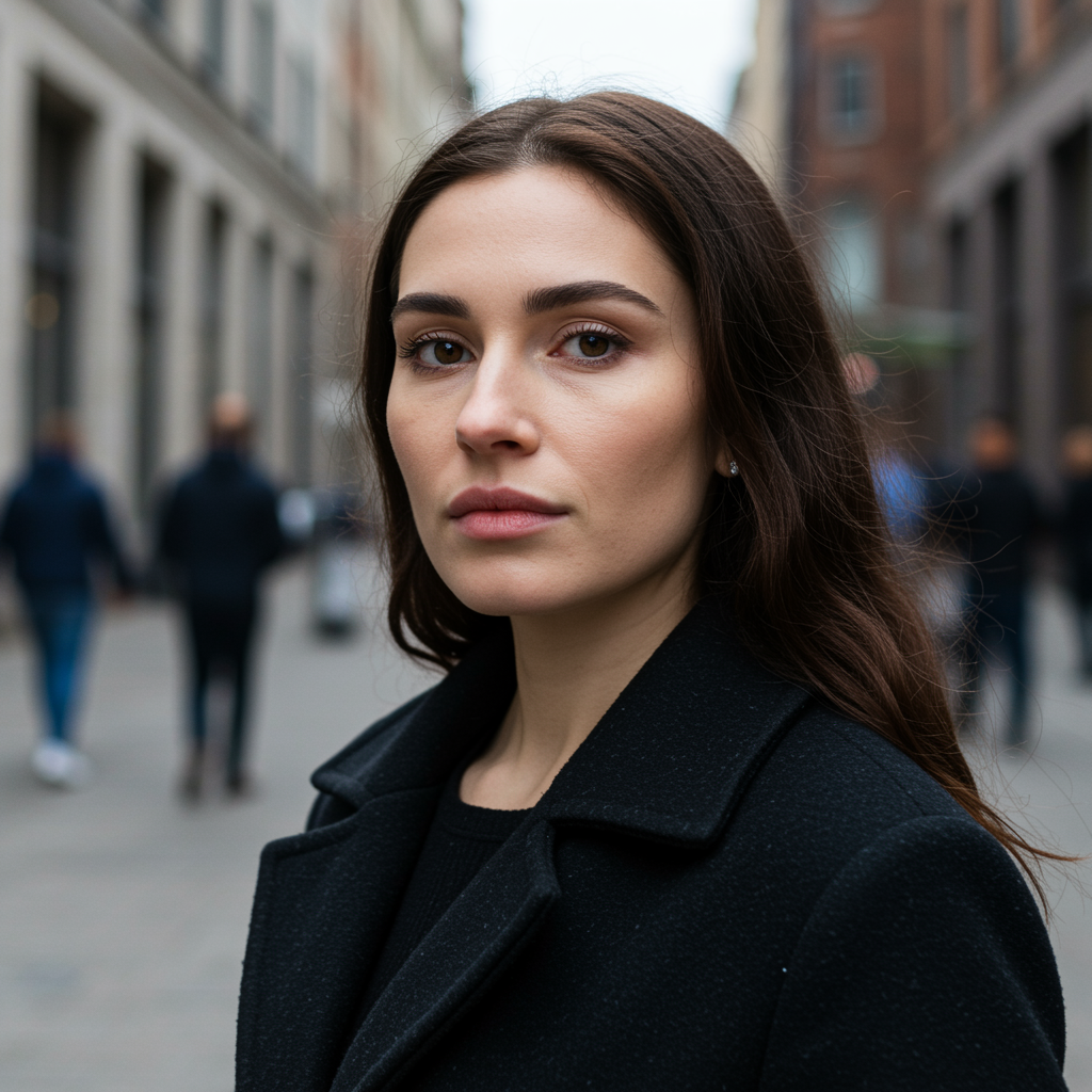 A stunning portrait of a woman standing alone, her face exquisitely detailed with a captivating expression, set against the backdrop of a bustling city street, the urban environment rich in texture and life.
