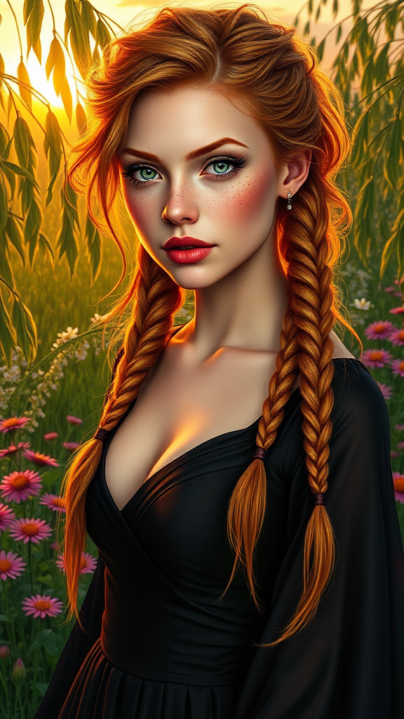 A stunning portrait of a woman with a detailed face, characterized by sensual, messy ginger hair adorned with long intricate braids. Her skin is kissed with freckles, and she possesses strong features, including a square jaw and high cheekbones. The sharpness of her features is complemented by heart-shaped lips and captivating green eyes. She dons a long, dark, elegant dress that highlights her hourglass figure and large chest. The scene is set in dynamic lighting during the golden hour, enveloped in a beautiful, colorful landscape. Around her, weeping willows and green grass dance among an array of vibrant flowers. This fantasy setting is captured in a hyper-detailed, elegant style reminiscent of an oil painting with art influences from Artgerm, Greg Rutkowski, Alphonse Mucha, and William-Adolphe Bouguereau. The composition features reflections and is rendered in an octane, high-quality photo-realistic style, appearing in UHD, HDR, and 8K resolution. It presents a zoomed-out full body view of the character without flaws or distractions from the core aesthetic.