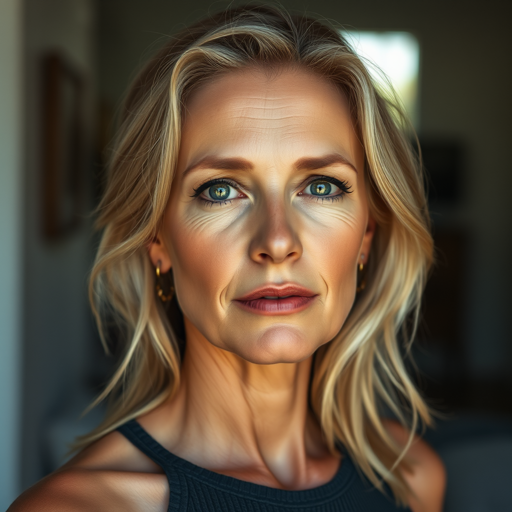 A stunning portrait of a woman with blonde hair in her 40s, gazing thoughtfully at the viewer. She stands in a full-body pose, captured with a Leica 50mm lens, showcasing the best quality and high resolution typical of Hasselblad photography. The lighting beautifully highlights the textured and imperfect skin, adding depth and character. This image blends elements of an airbrushed 3D render with the elegance of a painting, while incorporating hints of anime and manga illustration styles. Despite maintaining a realistic look, there are creative quirks like exaggerated eye size and subtle hints of an alternate anatomy, adding an artistic twist. Her face is an epitome of beauty, with just a touch of anime charm, without overemphasis on cartoon-like features. She wears minimal jewellery, allowing her natural presence to shine through.