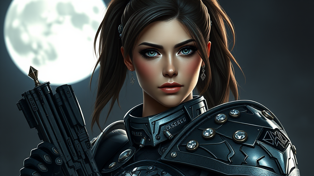 A stunning portrait of a woman with the enchanting face reminiscent of Tifa Lockhart, dressed in intricately designed armor adorned with shimmering gems, inspired by Warhammer 40k's Adepta Sororitas. Her highly detailed face radiates beauty, highlighted with a gentle blush and subtle pink eyeshadow. Her hair is styled in a sleek ponytail, complementing her fashion-forward presence. She stands confidently with a gun, set against the backdrop of a luminous full moon, creating a dramatic chiaroscuro effect. The scene is lit with cinematic lighting, emphasizing the ornate details of the armor. This fashion portrait captures an essence of elegance and strength, blending elements of realism and stylization, while avoiding any visual distortions or exaggerated features.