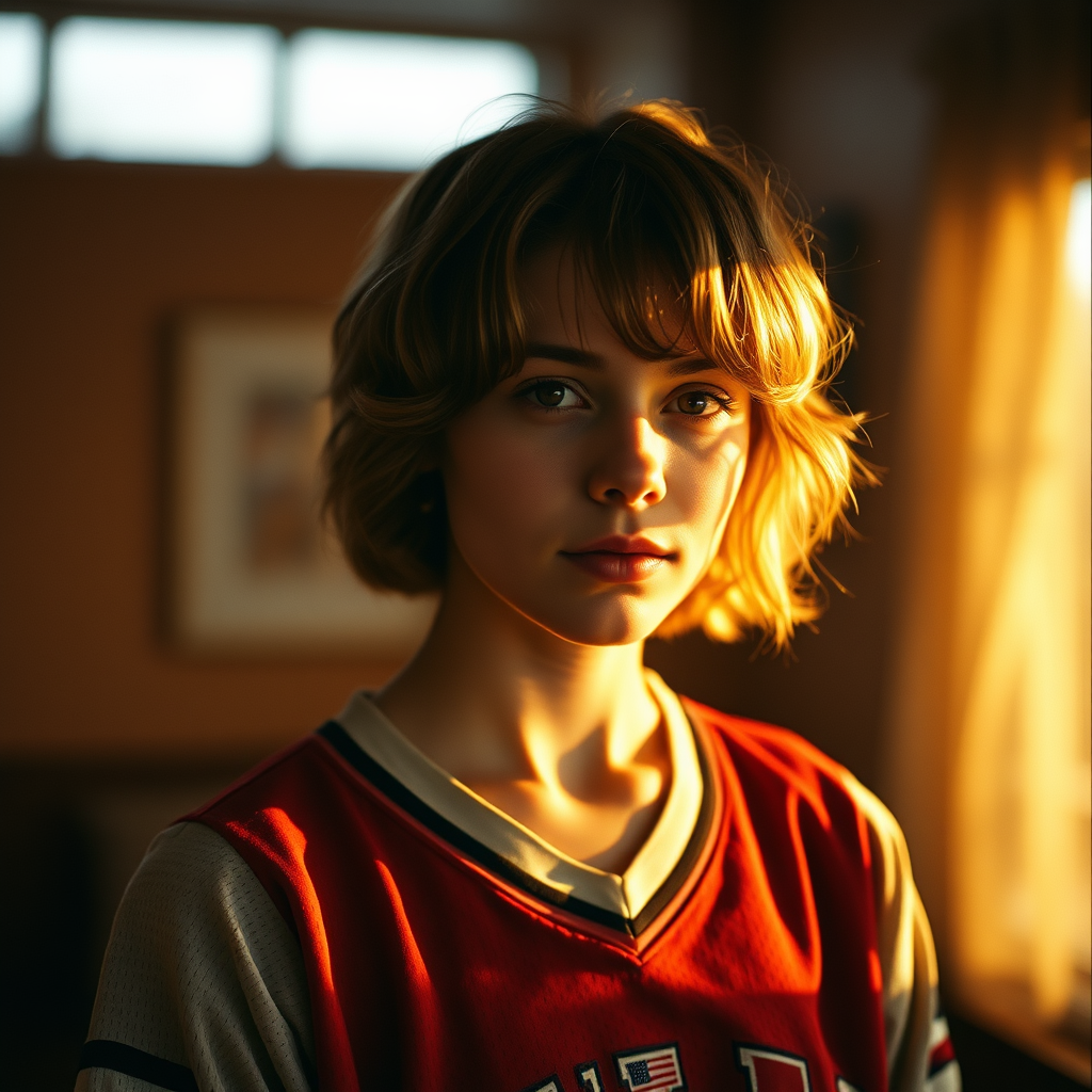 A stunning portrait of a young American woman with short wavy hair, wearing a vintage sports jersey, captured indoors during golden hour. The dramatic lighting casts warm tones across her features, enhancing the photorealistic quality. Shot on Kodak Portra 800 film, the image boasts an ultra-high resolution, capturing every detail in 8k clarity, with an aspect ratio of 9:16. The soft shadows and rich colors blend perfectly, creating a timeless and captivating atmosphere.