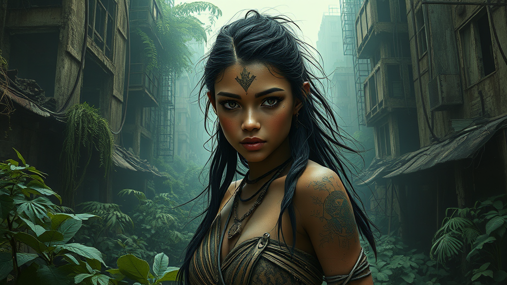 A stunning portrait of a young, captivating tribal woman in an overgrown post-apocalyptic city, where nature reclaims urban decay. Inspired by the styles of Luis Royo and Greg Rutkowski, the scene is dark and gritty, with intricate details and volumetric lighting enhancing the atmosphere. This concept art, suitable for a cover illustration, captures dynamic movement in an 8k resolution, rendered with octane for a lifelike finish. Her expression is a mix of determination and serenity, standing amidst lush foliage and crumbling structures, without any text or identifiable marks, entirely focused on the visual artistry.