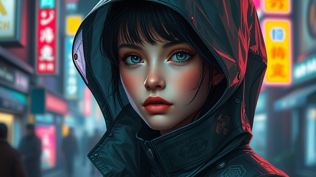 A stunning portrait of a young European girl in a sleek, futuristic raincoat, inspired by sci-fi fashion and royal elegance. Her attire blends elements of classic and modern design, featuring intricate details reminiscent of Ismail Inceoglu and Dragan Bibin’s imaginative realms. The coat is adorned with motifs that echo Hans Thoma’s and Greg Rutkowski’s artistry, with a touch of Alexandros Pyromallis' avant-garde style. Her face is perfectly sculpted, with sharp features and fine shading, reminiscent of Nekro's and Rene Magritte’s surreal influence. The setting exudes cyberpunk vibes, with neon-lit aesthetics and a synthwave palette, capturing a Blade Runner-esque scene of a futuristic Neo-Tokyo. This portrait melds realism with visionary design, presenting a beautiful face illuminated by low-emission neon lights, exuding an air of mystery and futuristic allure.