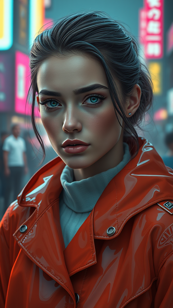 A stunning portrait of a young European woman in a futuristic raincoat, inspired by sci-fi fashion and royal attire. Her features are beautifully rendered, with a perfectly symmetrical face, sharp chin, and detailed shading. The look merges cyberpunk and neotokyo aesthetics with synthwave elements, capturing a scene reminiscent of a Bladerunner movie. Elements of a low-emission neon-lit city create a vibrant backdrop, enhancing the futuristic vibe. Her expression is serene yet intense, framed by realistic textures and subtle color contrasts, embodying elegance and modernity. Her futuristic jacket reflects a blend of historical opulence with sci-fi innovation, resonant with the styles of Ismail Inceoglu and Greg Rutkowski. The scene captures a blend of artistic inspirations, rendering a vision of future style in a mesmerizing and cohesive depiction.