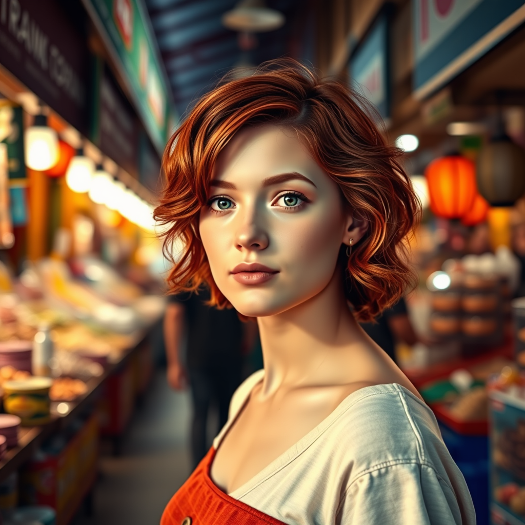 A stunning portrait of a young redheaded woman with wavy short hair standing solo in a bustling market, surrounded by vibrant stalls and colorful wares, evoking a sense of lively ambiance and capturing the essence of everyday life in exquisite detail.