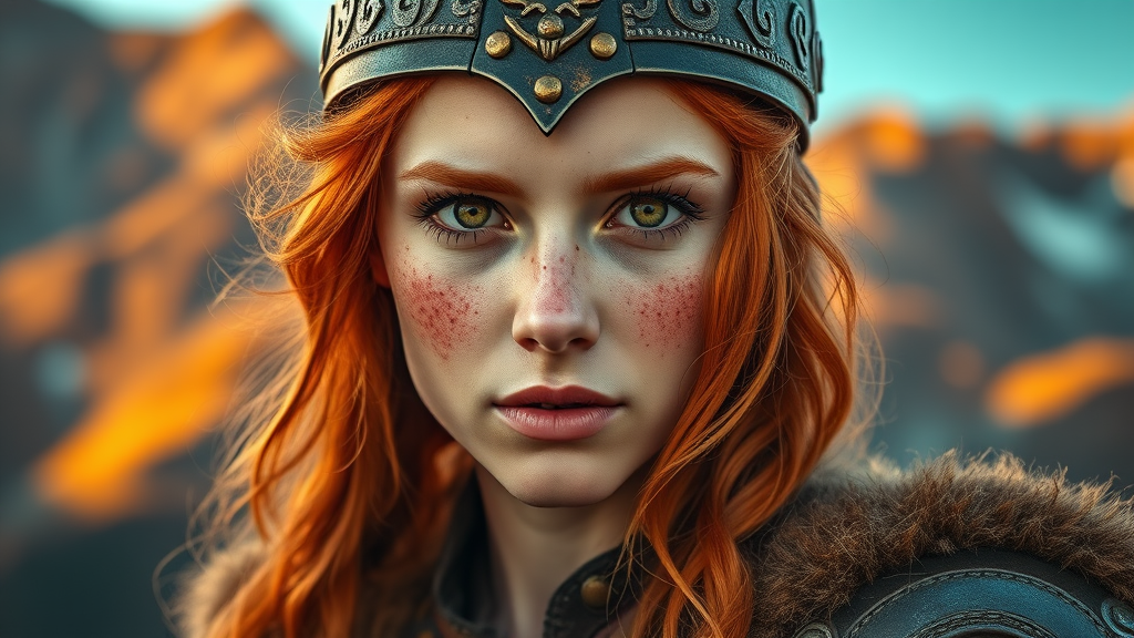 A stunning portrait of a young woman dressed as a Viking warrior, her fiery red hair cascading around her freckled face. Her eyes, vibrant and full of detail, capture the spirit of the sea and the fire of battles past. She wears intricately designed Viking armor that gleams in the sunlight, with a helmet adorned in ancient runes that speak of valor. The mountainous backdrop is bathed in a golden hue, setting the scene for this epic tale of courage and strength. This full head portrait is captured in a cinematic style, with dramatic lighting that accentuates every intricate detail, casting an aura of realism that transforms her into a legend. The atmosphere is one of tranquility and intensity, blending seamlessly to form a masterpiece of storytelling and visual grandeur.