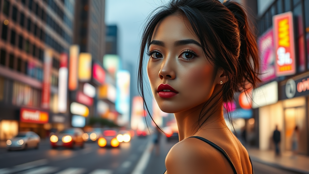 A stunning portrait of a young woman, her ultra high detailed face illuminated by the city lights as she stands alone on a bustling road, capturing the essence of urban life with an air of serenity and confidence, the vibrant cityscape providing a dynamic backdrop of towering buildings and lively streets.