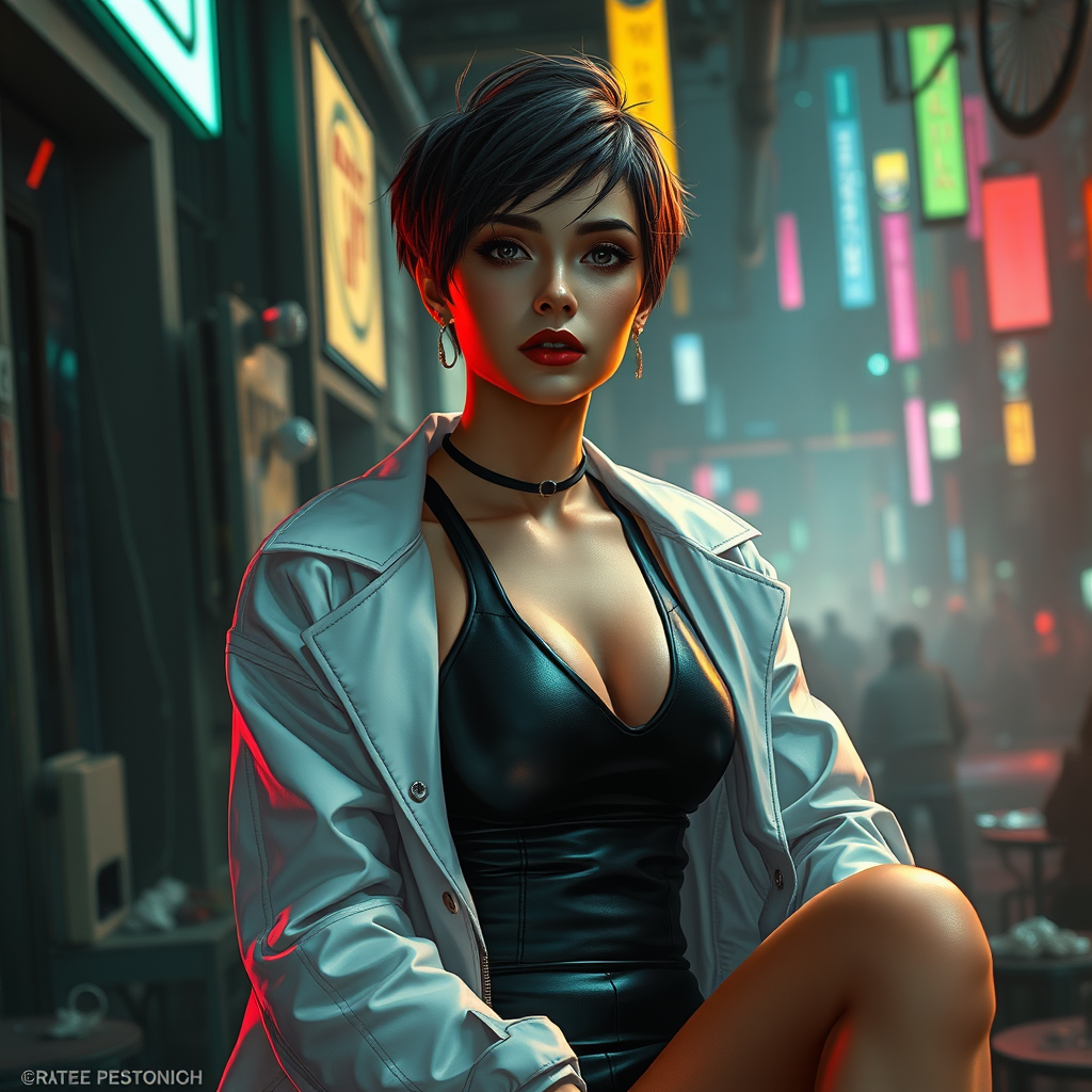 A stunning portrait of a young woman sitting solo in a cyberpunk world, her presence akin to official art captured in unity 8k resolution. The image is ultra detailed, showcasing her glowing skin and the beautiful chaos around her. Her elegance is set against a brutalist backdrop, infused with vivid colors that hint at romanticism. In a wide shot, she wears a sleek black bodysuit paired with a striking white jacket, her red lips contrasting with her short hair. The scene is bathed in the dynamic energy of a Cyberpunk 2077 anime style, where the detailed background adds depth and allure, capturing the most beautiful form of chaos from afar.