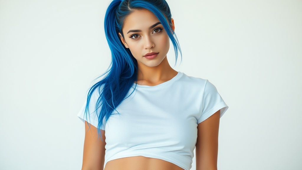A stunning portrait of a young woman with striking blue hair styled in a sleek ponytail. Her captivating eyes complement her outfit, featuring a white T-shirt and shorts that highlight the theme of serenity and elegance. Her medium build and visible navel add to her relaxed but confident pose, embodying a sense of poise and charm. Captured in extraordinary detail with 8k UHD and HDR quality, the setting balances a harmonious blend of white and blue tones. Although perfectly composed, subtle distortions introduce an artistic flair, with elongated features and additional elements adding a unique character. These mutations contribute to an engaging visual narrative while avoiding clarity issues like blur, noise, and digital artifacts, ensuring an uninterrupted view of this creative masterpiece.