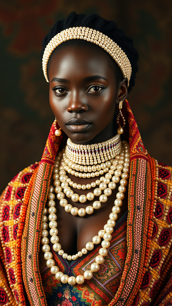 A stunning portrait of an arabesque woman adorned with a beaded shawl and an elegant pearl necklace, capturing the essence of Ororo Munroe in a vibrant Afrofuturism style. Her attire radiates with strings of pearls and intricate beadwork, reminiscent of Maria Borges' regal grace. As the beautiful animal pearl queen, her presence echoes the artistic inspiration of Carrie Mae Weems. Her dress, a masterpiece of delicate beads, pays homage to the visionary style of Gordon Parks. The photograph encapsulates the beauty and strength of a black woman, as if captured by the lens of Lily Delissa Joseph, exuding a sense of timeless elegance and cultural richness.