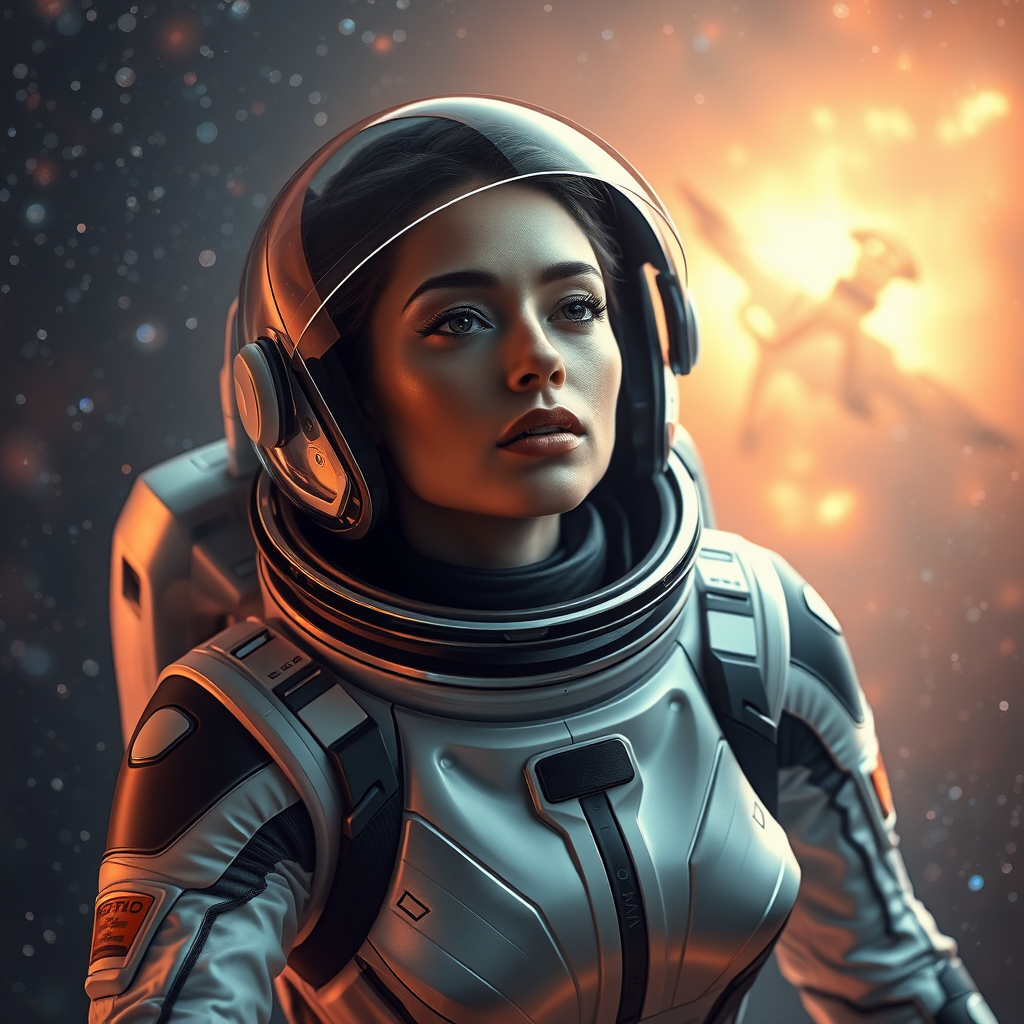 A stunning portrait of an elegant woman in a sleek futuristic space suit, gracefully drifting amidst the stars, captured in sharp focus with hyperrealistic details, evoking a cinematic atmosphere, ethereal glowing nebula in the background, soft light reflecting off her visor, expression serene and contemplative.