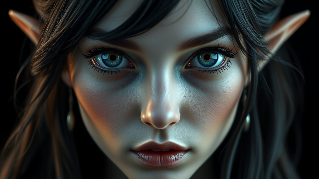 A stunning portrait of an exquisite elven healer set against a deep black background, featuring enchanting, realistically reflective eyes and flawless irises. Her captivating facial features exude femininity and allure. The style draws inspiration from artists like David Kassan and Ismail Inceoglu, embracing a hypermaximalist approach with volumetric lighting. The image boasts award-winning quality, deep, rich colors, and comes in 8k UHD HDR resolution. The composition focuses on a single model with perfect proportions and an intact, harmonious form, free from distortions or anomalies. The background and overall clarity exhibit high resolution without any artifacts like watermarks, logos, or unnecessary text elements, ensuring a complete, immersive visual experience.