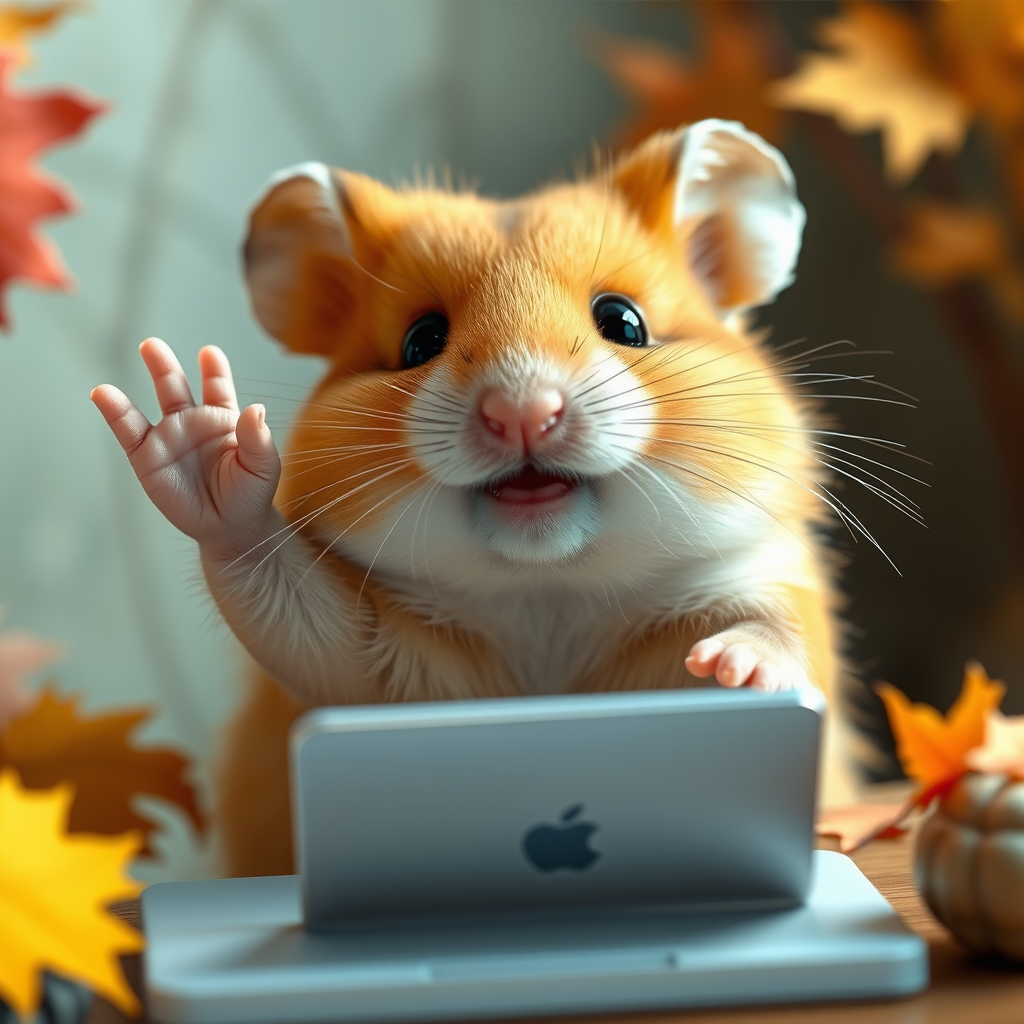 A stunning portrait of an incredibly cute and endearing golden hamster who is cheerfully waving goodbye while crafting a whimsical blog post. The hamster's smooth and perfect face radiates charm, inspired by the character design styles of Mark Ryden, Pixar, and Hayao Miyazaki. This concept art captures sharp focus and intricate detail, with vibrant harvest fall colors adding warmth and richness to the scene. Cinematic lighting enhances the hyperrealistic quality, creating a diorama-like macro photography effect. The image is rendered in exquisite 8k and 4k resolution, evoking a captivating blend of fantasy and realism.