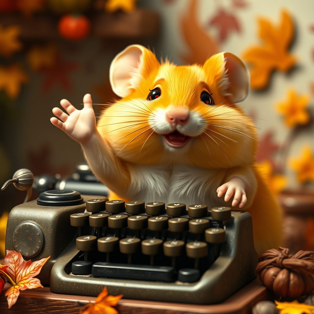 A stunning portrait of an irresistibly cute and charming golden hamster, cheerfully waving farewell while typing on a vintage typewriter, set against a whimsical background reminiscent of autumn harvest colors. The hamster's face is delightfully smooth and expressive, with character design influences from Mark Ryden, Pixar, and Hayao Miyazaki. The piece is rendered with sharp focus and incredible detail, showcasing vibrant fantasy elements, illuminated by cinematic lighting. It captures a hyperrealistic style with a composition that feels like a miniature diorama, evoking the intricate beauty of macro photography. Rendered in breathtaking 8k and 4k resolution, every element is intricately detailed, creating a captivating visual experience.