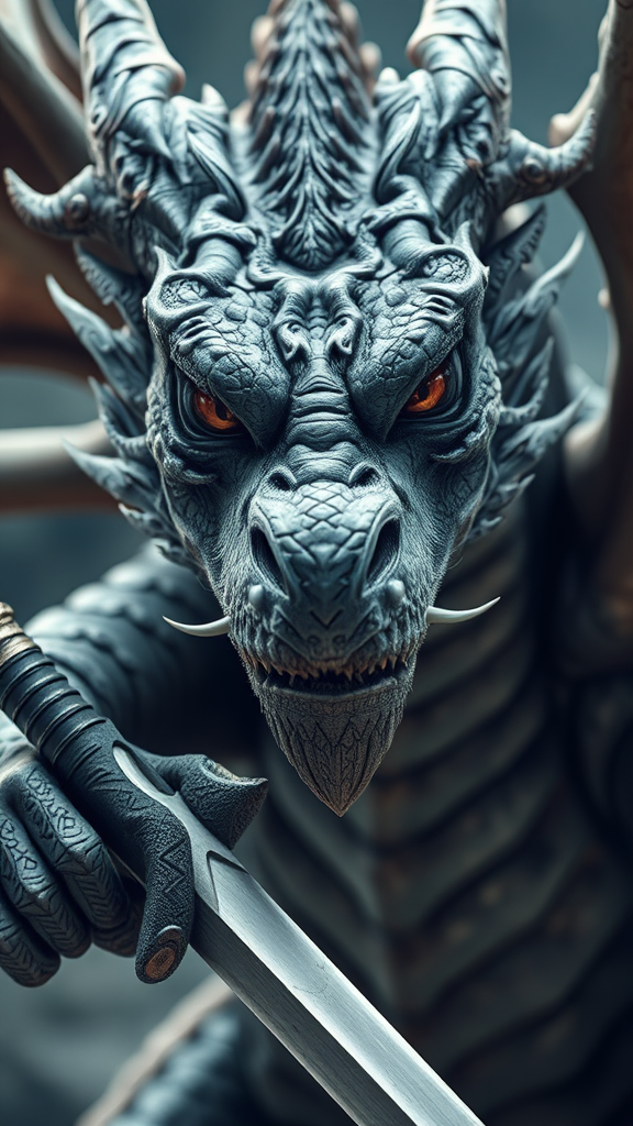 A stunning portrayal of a perfect-faced dragon warrior with expressive eyes, wielding a razor-sharp blade, captured in 8k resolution with impeccable sharpness and symmetry. Avoid elements such as low quality, text logos, watermarks, signatures, out-of-frame issues, and jpeg artifacts. Ensure the depiction is free from unattractive, poorly drawn features, extra or mismatched limbs or digits, flawed anatomy, and odd or impossible body positions. Maintain clarity and definition, steering clear of mutations, deformities, off-center compositions, duplicate faces, and any NSFW elements.