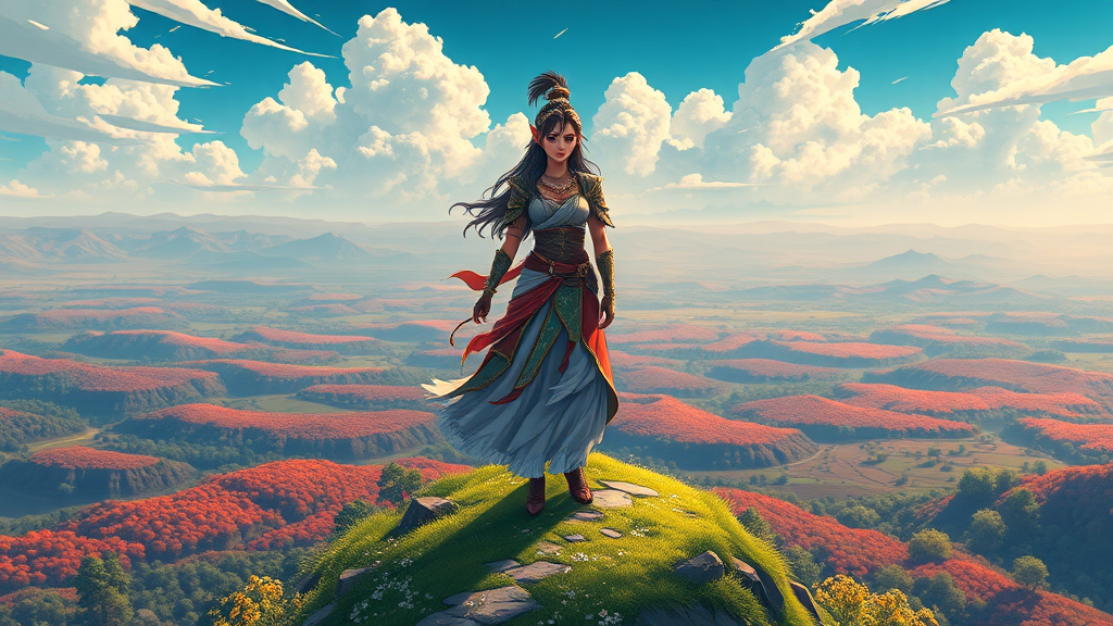 A stunning poster depicting a warrior goddess standing gracefully atop a hill, perfectly centered. Her face is exquisitely detailed and beautiful, embodying the essence of anime style. The scene is a key visual, capturing intricate and breathtaking details that evoke a sense of awe. The landscape around her is vibrant and panoramic, offering a cinematic view that draws inspiration from the styles of Carne Griffiths, Conrad Roset, and Makoto Shinkai. The overall image excludes any text or watermarks and maintains realistic proportions, ensuring no elements are blurry, fuzzy, or awkwardly drawn.