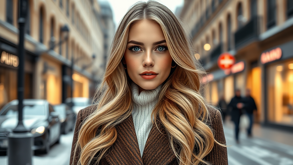 A stunning professional portrait of a captivating Norwegian girl wearing elegant winter attire. She has long, wavy blonde hair that flows effortlessly, complemented by a flirty expression and charming freckles. Her face is beautifully symmetrical, adorned with subtle, natural makeup. She stands in a snowy city street that highlights a sophisticated, modern urban landscape. The image is ultra-realistic and rendered as concept art, capturing intricate details with sharp focus. Shot with an 85mm lens at f/1.8, the medium, centered composition showcases professional color grading with bright, soft, diffused lighting and hints of volumetric fog. This visually striking portrait trends on Instagram and Tumblr, presented in rich HDR quality in both 4K and 8K resolution.