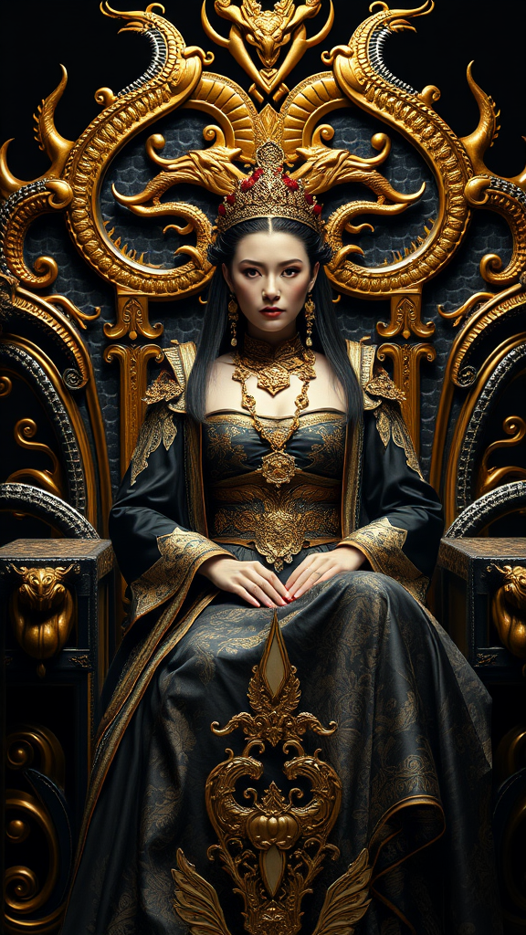 A stunning queen elegantly seated on a throne crafted from black and gold, embodying serpent-dragon motifs with intricate detailing. The scene is bathed in dramatic cinematic lighting, capturing hyperrealistic textures and photorealistic depth. 8k sharp focus is utilized with immersive effects reminiscent of unreal engine 5. The style showcases expressive 2D artistry, highlighting every ornate element of both the throne and the queen's exquisite attire. The composition is perfectly balanced, presenting the queen with flawless anatomy and a captivating, regal presence.